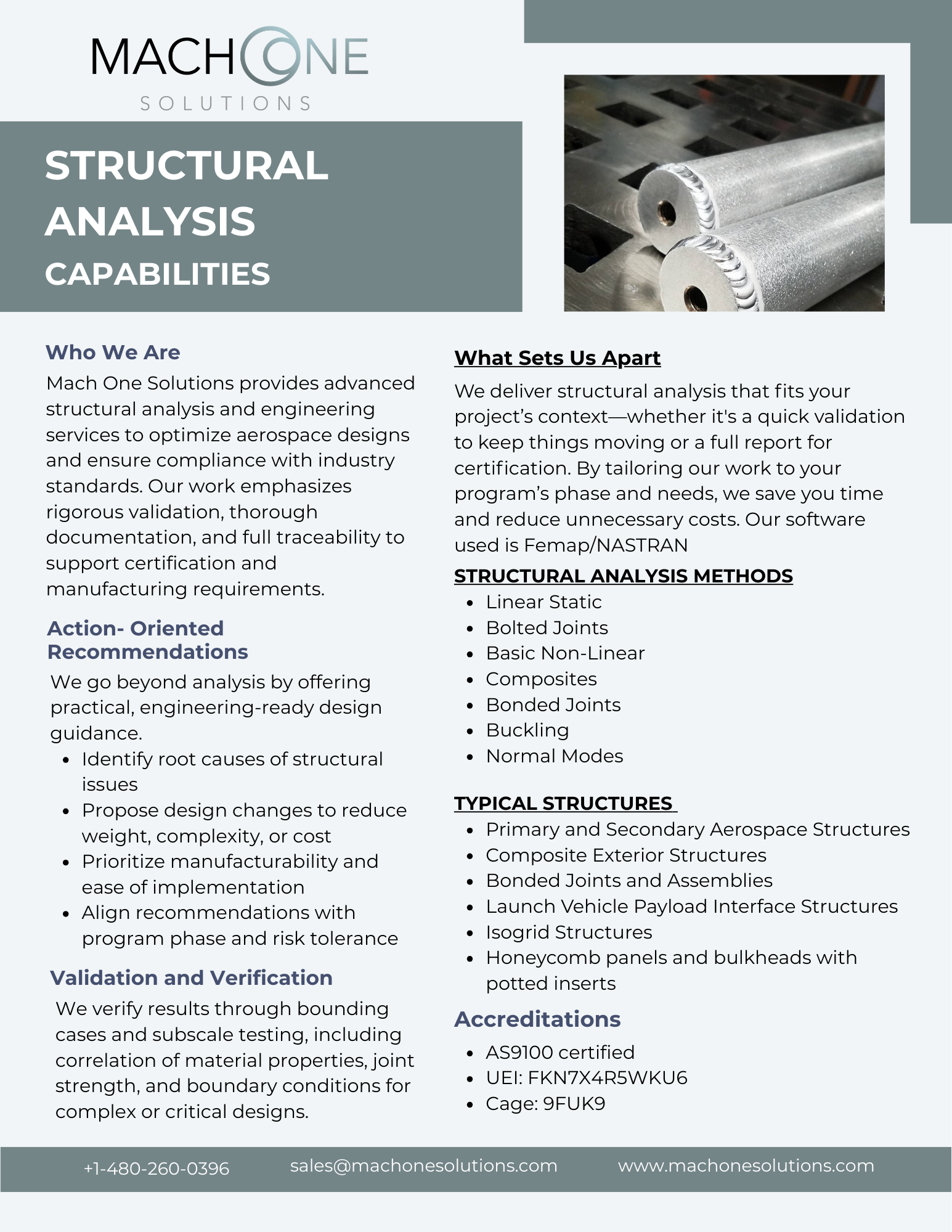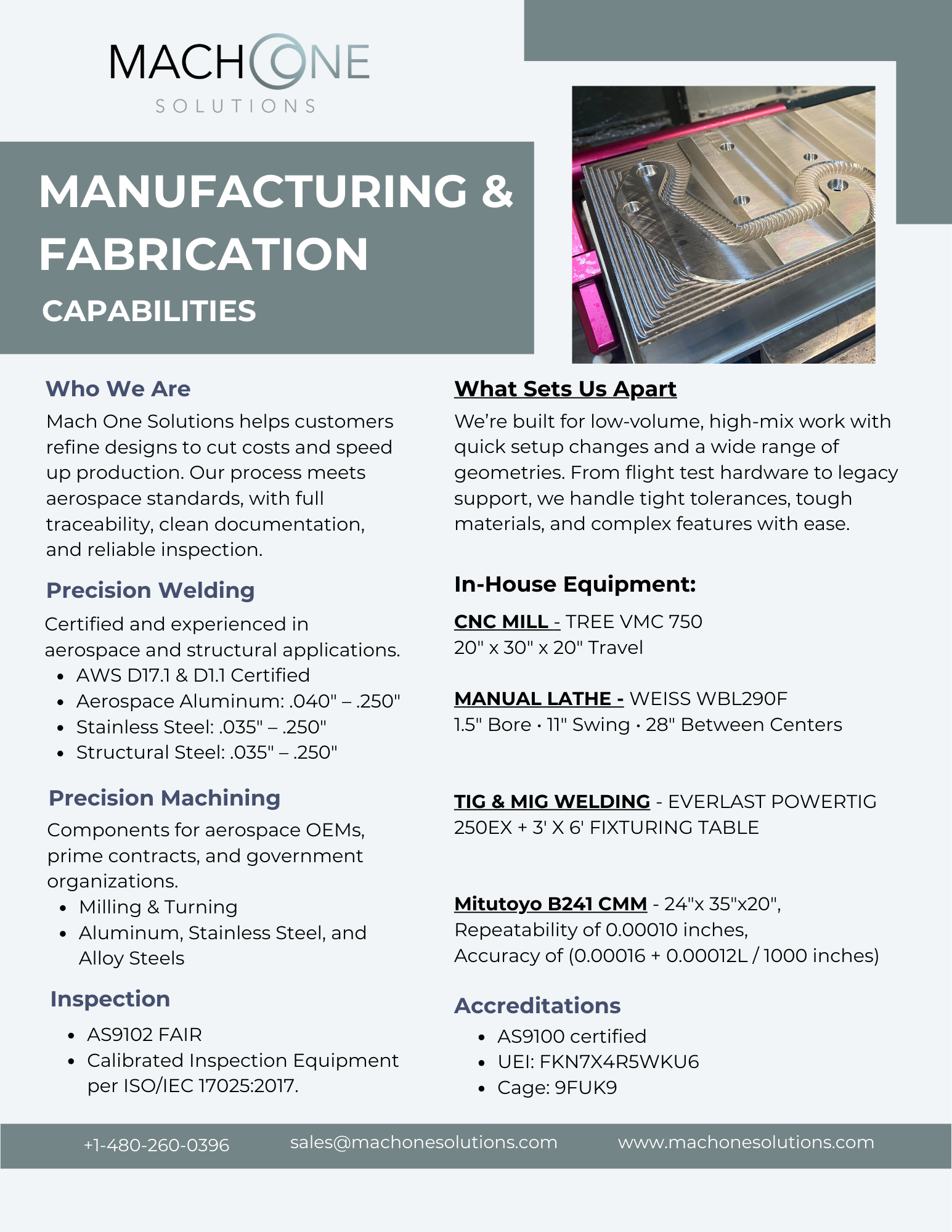“Mach One Solutions is committed to leading the aerospace community by exceeding customer expectations and fulfilling applicable requirements through continual process improvement. Requirements met; on time, every time.”
